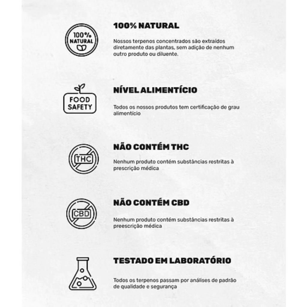 Precauções: Manter ao abrigo da luz, calor ou ambientes umidos. O armazenamento inadequado pode causar degradação dos terpenos. Se o produto estiver em sua forma concentrada, evite o contato direto com a pele, olhos ou a boca.