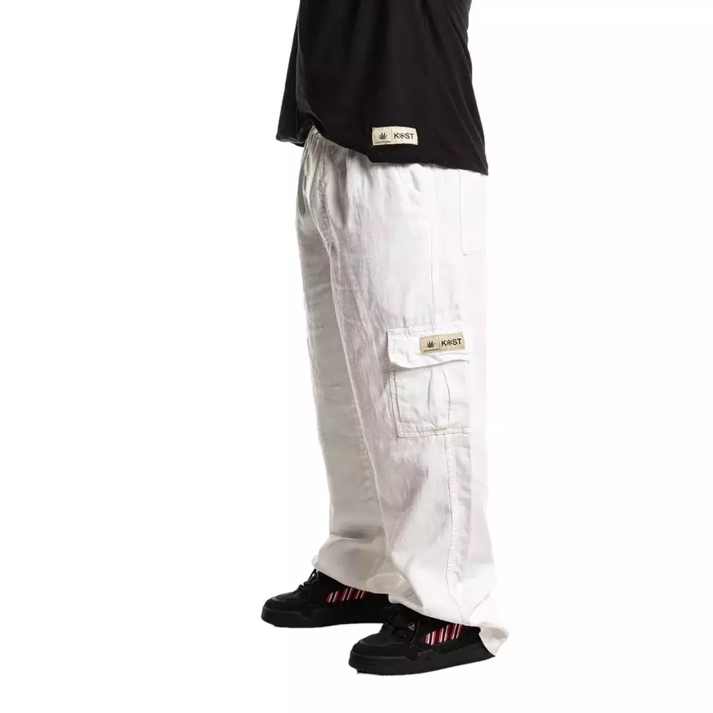 A Calça de Cânhamo Kost combina estilo urbano com sustentabilidade. Disponível nos modelos cargo e sarja, em cores como off-white, preto e verde, oferece conforto, durabilidade e um visual moderno.